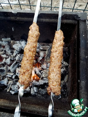 Жарить кебабы на умеренно-жарких углях, переворачивая, до готовности.