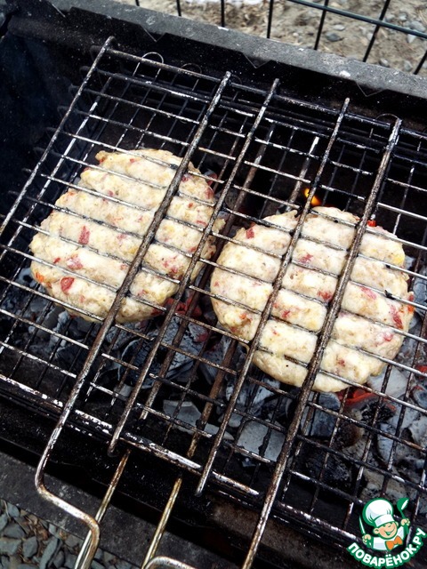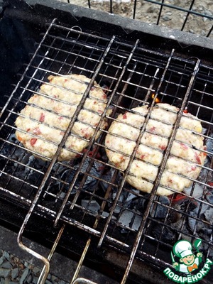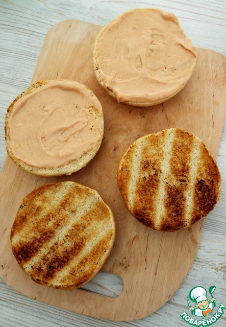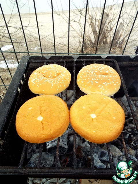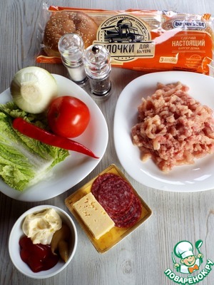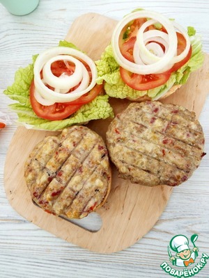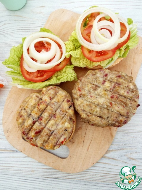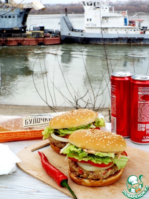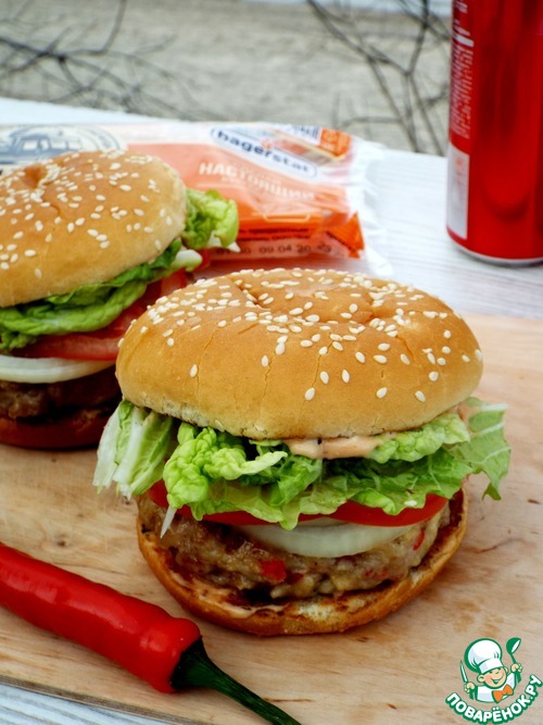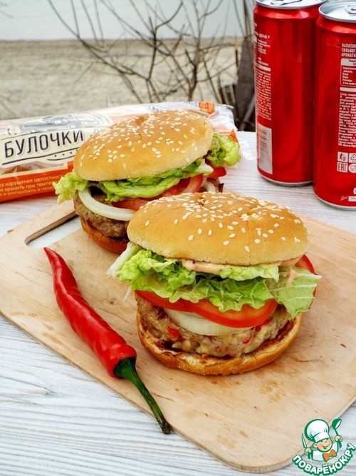 С приходом весны, появляется огромное желание, отправиться на природу и готовить разные вкусные блюда на гриле. И так сказать для начала, для разгоночки, хочу предложить вам вот такой замечательный бургер! В нежной булочке "спряталась" сочная куриная котлета с "сюрпризом", свежие овощи и пикантный соус! У бургера, приготовленного на открытом огне, сногсшибательный аромат, которого к сожалению не добиться в домашних условиях. Но если очень хочется, можно приготовить такой бутерброд на кухне))..