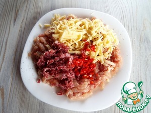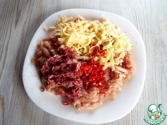 В фарш мелко нарезать перец чили и колбасу. Натереть на крупной тёрке сыр. Подсолить и поперчить по вкусу. Хорошенько перемешать.