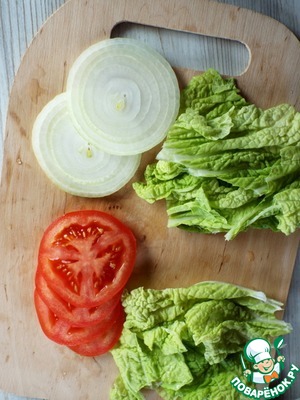На нижнюю часть выложить котлету. На верхнюю - овощи.