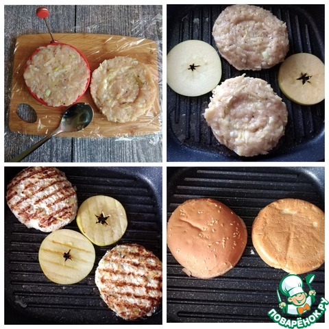 Делаем фарш куриный из любой куриной мякоти или покупаем готовый. Лук репчатый мелко нарезаем. От яблока поперёк отрезаем половину, натираем на тёрке средней величины. Отправляем в фарш яблоко, лук, перец и соль. Тщательно вымешиваем фарш. Раз пять отобьём его ударив об дно посуды. Фарш готов. Формируем котлеты. Доску нужно застелить пищевой плёнкой, с неё легко вы снимете формированные котлеты на лопатку. Я использую кольцо силиконовое. Оно высотой-1,5 см и в диаметре для стандартного бургера. Если нет такого, то котлеты нужно сформировать в D = D булочки или чуть больше и толщиной - 1,5 см.