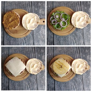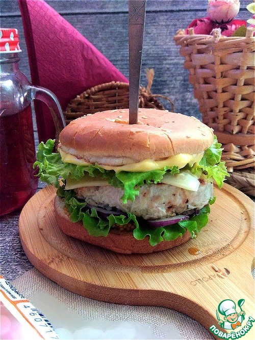 Начинаем собирать чикенбургеры. Одну половинку нижнюю щедро смазываем зернистой горчицей, вторую верхнюю - майонезом. На горчицу выкладываем порванные листья салата и красиво их укладываем. На салатные листья - кольца красного лука, у меня крымский. Он сладкий и не злой. Снимаем со сковороды котлеты и сразу же выкладываем их на лук и сверху помещаем пластину бутербродного сыра, чтобы он от горячей котлеты подплавился. На сыр - жареную дольку яблока и опять помещаем листья салата, накрываем верхней частью булки с майонезом. Готовы!
