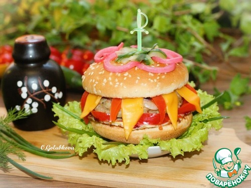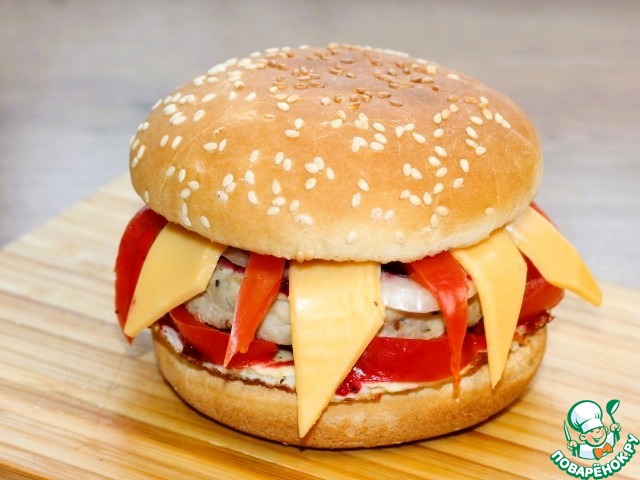 Очень вкусный бургер с печеным перцем, яйцом, котлетой и брусничным соусом.