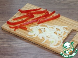 3. Нарежьте полукольцами лук, а запеченный болгарский перец — полосками.