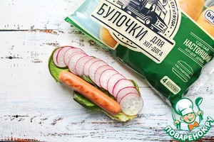 Редиску порежьте тонкими кружочками и уложите на листья салата вместе с сосиской. Сосиску для удобства можно разрезать вдоль на две половинки.