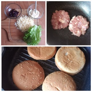 Вначале нужно сделать фарш для котлет. Какое вы выберете мясо не принципиально. Конечно для бургера лучше взять говядину. Я возьму то, что есть - куриное бедро. Котлеты буду делать рубленные. Сняла кожу с бедра, она не нужна. Жирок оставьте. Делаем филе и нарезаем его ножом очень мелко. Помещаем в посуду, солим и перчим по вкусу. Хорошенько вымешиваем фарш и отбиваем раз 5 об дно посуды. Фарш должен быть клейким, а значит котлеты при жарке не развалятся. Формируем котлеты на доске, покрытой пищевой плёнкой. D котлеты=D булочки или чуть больше. Они ужарятся. Высота котлеты примерно 1,5 см. Котлеты убираем в холодильник, пока будем заниматься другими продуктами.
