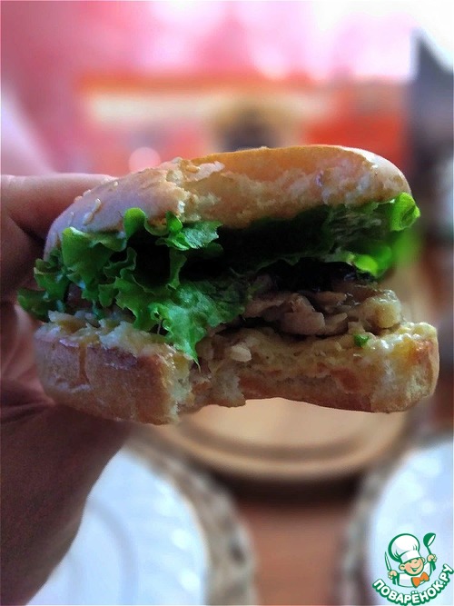 Бургер с рубленой куриной котлетой, расплавленным натёртым сыром Грюйер и жареным красным луком с добавлением красного сухого вина. Слегка острые и маслянистые.