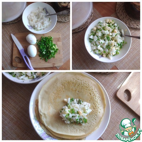 Для начинки возьмём 3 ст л с горкой отваренного круглого риса, заправленного сливочным маслом. Два крупных яйца вкрутую и перья зелёного лука от одной луковицы. Всё перемешаем. Начинка как на пирожки готова. Заворачиваем блины. Выкладываем начинку щедро, но чтобы блины можно было завернуть. Выкладываем на низ блина, отступя от края ~ 2,5-3 см. Далее перегибаем оба края (слева и справа) и закручиваем блин.