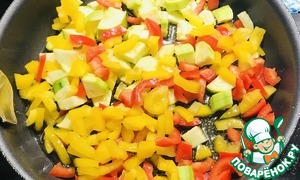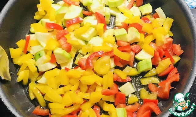 Кубиками нарезать все овощи, обжарить на растительном масле до полу-готовности
