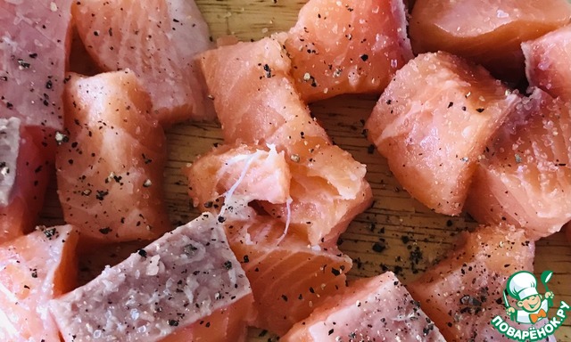Семгу обмыть, обсушить бумажным полотенцем, порезать на кубики, посолить, поперчить