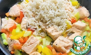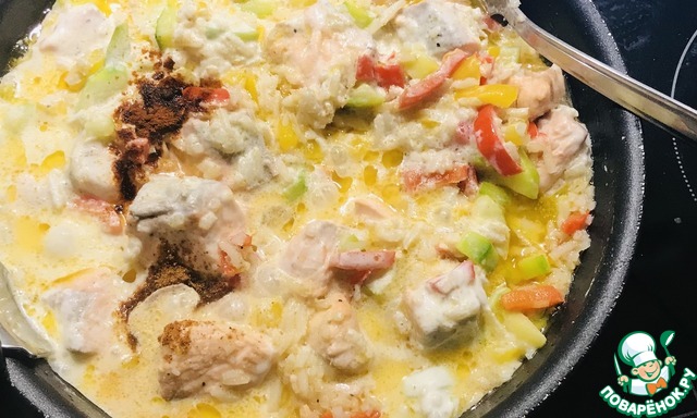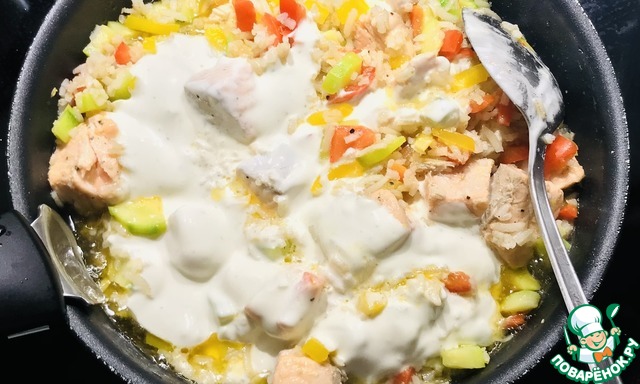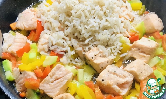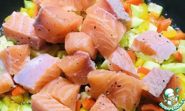 Перемешать, на тихом огне прожарит (протушить )до готовности семги -5-7 мин.