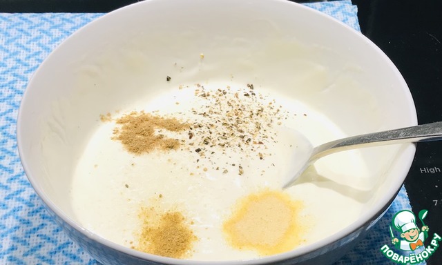 Сметану соединить с йогуртом. Добавить паприку сладкую, орех мускатный, перец чили, перемешать.