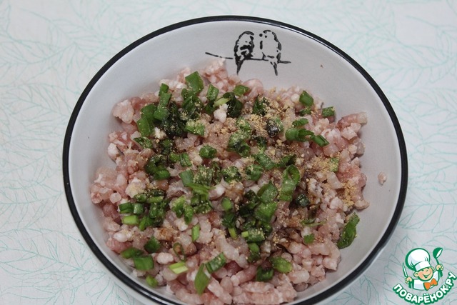 В фарш влить соевый соус, добавить мелко нарезанный зубчик чеснока, жгучий перец, имбирь, зеленый лук.