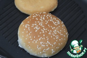 Булочки уже разрезаны, поэтому обжариваем срезы булочек на сухой сковороде.