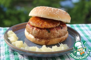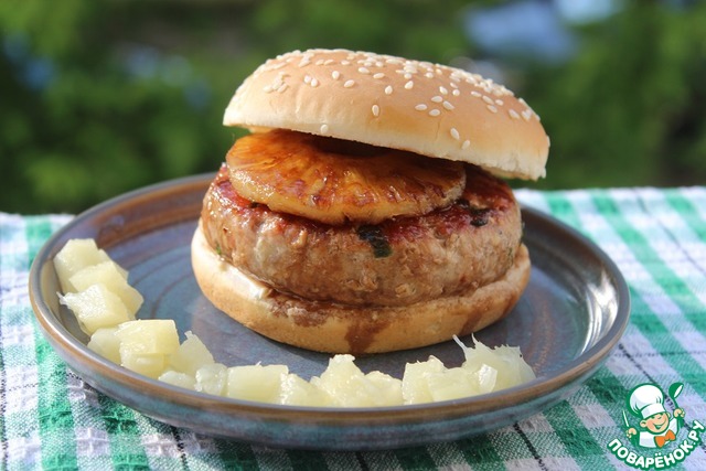 Очень лаконичный по составу бургер с пикантным вкусом. Сочнейшая котлета из свинины, ананас и булочка с кунжутом TM "Bagerstat", смазанная творожным сыром. Необычно и пикантно. Пробуем?