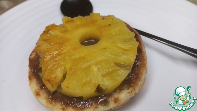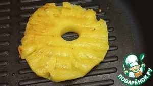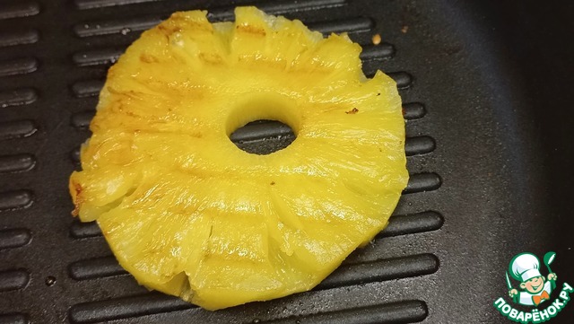 Кольцо ананаса, выкладываем на сковороду после булки, готовим до румяных полосок.