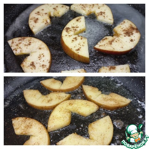 На сковороде растапливаем сливочное масло, не допуская лишнего кипения. Выкладываем дольки яблока ровным слоем, готовим несколько минут. -