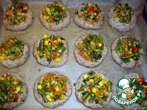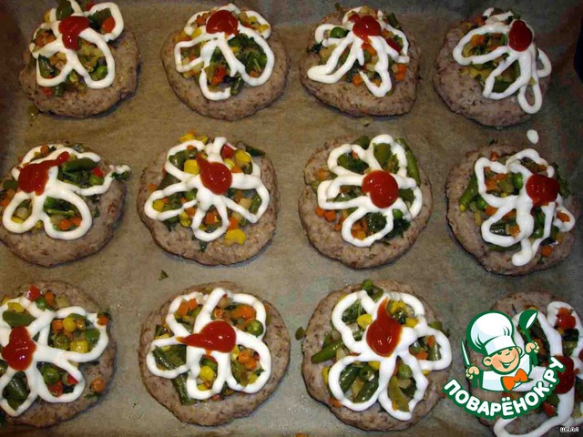 Поливаем наши "котлетки" майонезом и кетчупом, у меня ромашки получились, и отправляем в разогретую духовку на 15-20 минут.