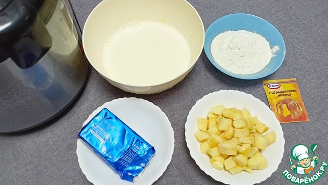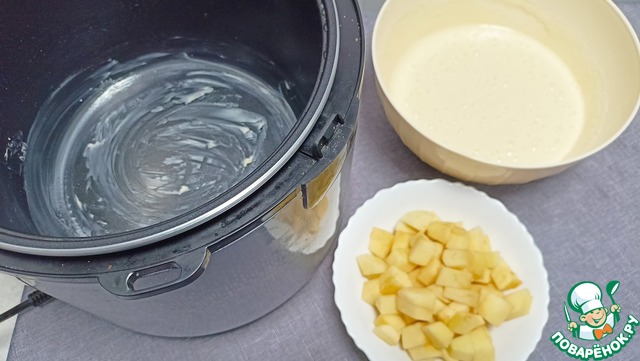 Смазываем борта и дно чаши маслом, и начинаем выкладывать тесто. Выкладываем примерно 40%, после чего делаем слой яблок. Далее 30% теста, и вновь яблоки. Закрываем оставшимся тестом — Режим «Выпечка» 60 минут.