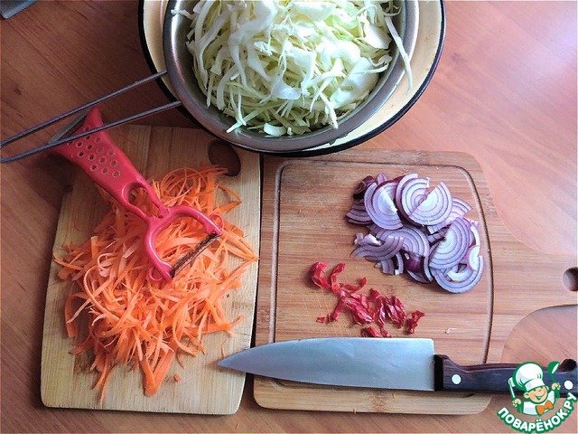 Шинкуем капусту. Готовим дуршлаг и кипятим воду в чайнике. Морковь нужно натереть на тёрке (хотя бы на средней, если нет корейской). Измельчаем острый перец, убрав из него семена. Лук нарезаем перьями или соломкой.
