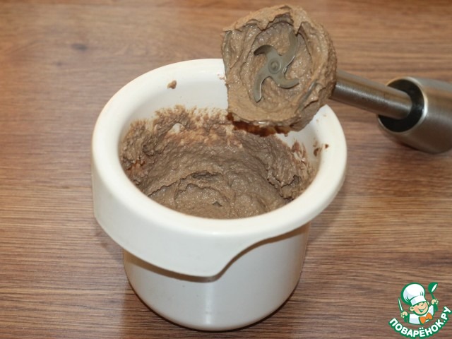 1. Вначале, я приготовила фарш для котлет. Залила печень крутым кипятком и оставила на 10 минут. Удалила из печени пленки и жёлчные протоки, промыла и нарезала кусочками. Посолила, поперчила, влила немного сливок и измельчила блендером.