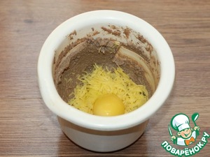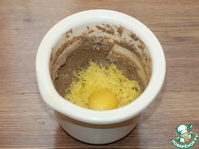 2. Добавила тертый картофель и яйцо, перемешала. Если тесто очень жидкое, можно добавить панировочные сухари.