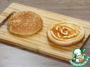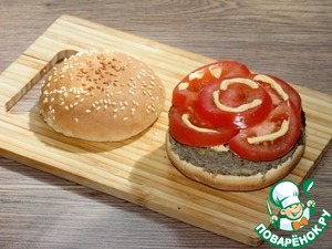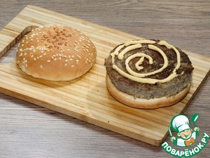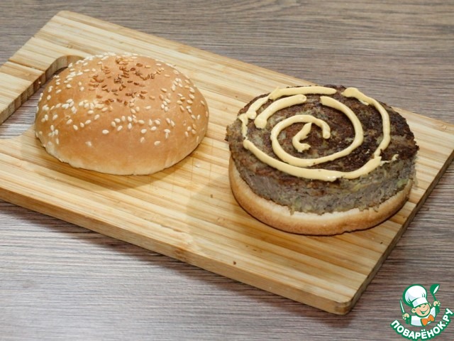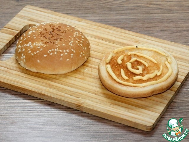 7. Нижнюю часть булочки смазала соусом для бургеров. Состав соуса для бургеров: яичный желток, маринован. огурец, горчица, томат. паста,...