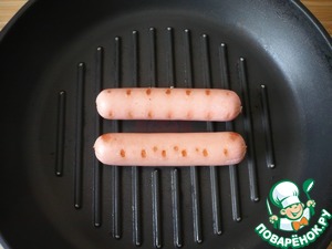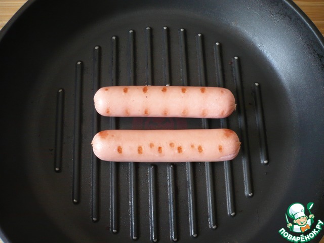 • Затем на сковороде-гриль поджарьте сосиски.