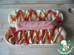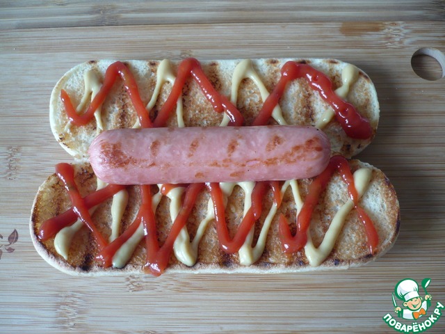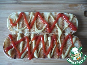 • Обжаренные булочки смажьте горчицей и кетчупом по вкусу.