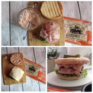 Проснулись утром на даче, заглянули в холодильник и быстренько сообразили сделать для себя (любимой) бургер на завтрак из самых, что нинаесть, дачных продуктов! Хорошо, что хоть булочка Bagerstat для меня осталась. Она поможет ещё быстрее сотворить мне завтрак. Булочки мягонькие, нежные и уже порезанные напополам. Делаем соус. Майонез и кетчуп смешиваем в посуде и добавляем туда мелко порезанный маринованный корнишон. Колбаса у меня небольшим диаметром и я возьму её 3 ломтика. Бекон у меня в нарезке сырокопчёный.