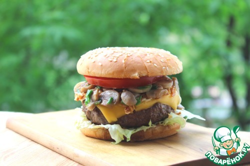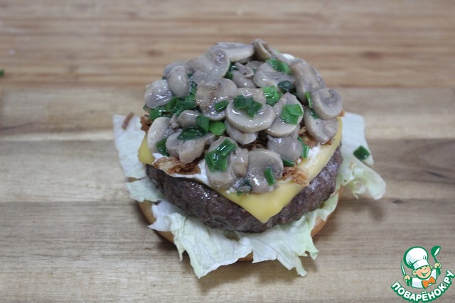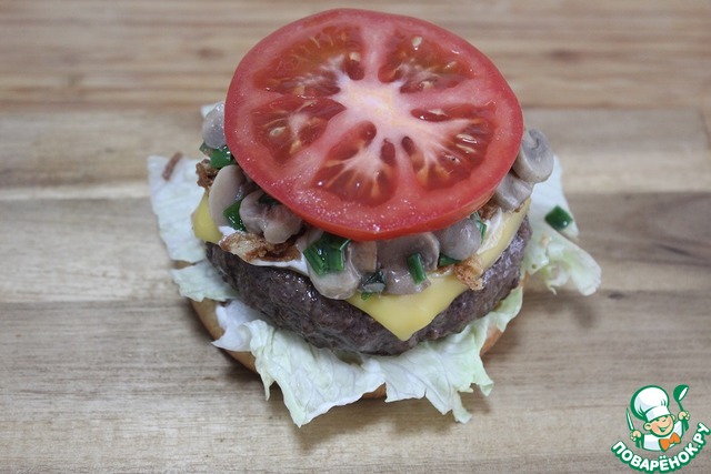 Очень сытный, нажористый бургер. Высокий, но неудобств никто не испытывал))) Удачное сочетание - сочная говяжья котлета с сыром, пикантный соус с хреном, хрустящий жареный лук и листья салата, сливочные грибы с зеленым луком и помидор, а все это в нежнейшей булочке для бургера с кунжутом от TM "Bagerstat". Это полноценное блюдо, проверено! Пробуем?