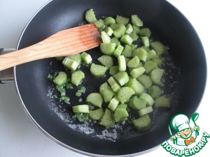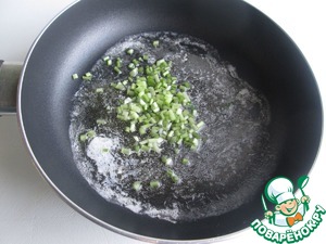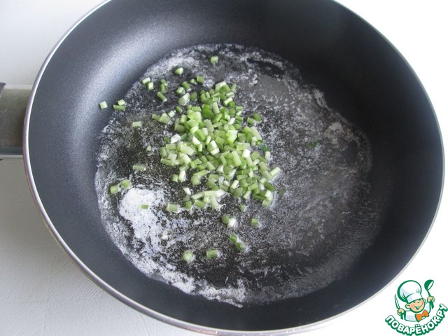 На холодную сковороду поместить кусочек сливочного масла и поставить на средний огонь. Как расплавится, добавить нарезанную белую часть.
