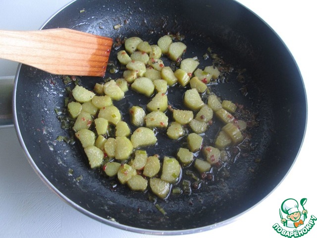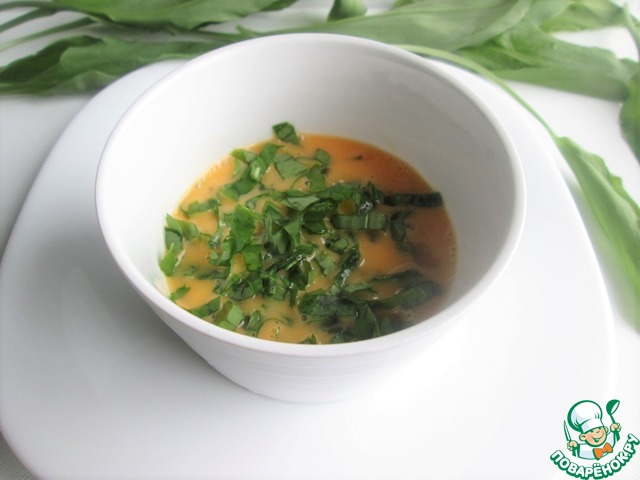 Слегка взбить венчиком до однородности и вмешать половину порции нарезанной черемши.
