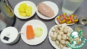 Мелко шинкуем лук и морковь. Картофель, сырки и курицу средними кусочками. Грибы для красоты слоями.