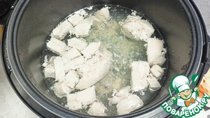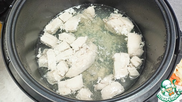 Отправляем в чашу воду и куриное филе — Режим «Тушение/Суп» 40 минут.