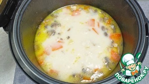 Добавляем в чашу кусочки сыра и курицу (можно и зелень) - Режим "Тушение/Суп" 20 минут.
