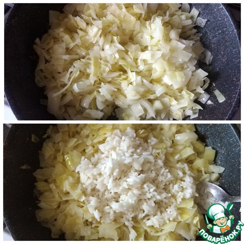 Делаем начинку. Рис должен быть уже отваренный. В сковороду наливаем масло, греем его и выкладываем лук, порезанный произвольно. Золотим лук до мягкости. Не зажаривайте сильно, это скажется на вкусе пирожков. Выкладываем к луку капусту, нашинкованную произвольно, но не крупно. Обжариваем с минуту, присаливаем. Капуста даст сок, доливаем немного воды и томим капусту под крышкой до готовности на минимальном огне. Когда капуста будет готова, открываем крышку, прибавим огонь и готовим её до полного выпаривания влаги. Добавляем рис отваренный, перемешиваем, пробуем на соль (если надо, то корректируем по вкусу) и снимаем с огня.
