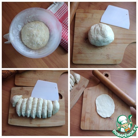 Пока капуста готовится, замешиваем тесто. Муку просеиваем в посуду, где будем делать тесто. Добавляем соль и сахар, а так же - дрожжи. Перемешиваем, делаем углубление по центру и наливаем туда воду и масло. С оливковым маслом пирожки будут румянее. Силиконовой лопаткой замешиваем тесто, а затем начинаем работать руками. Смажем их немного маслом. Тесто отличное. К рукам не липнет. Скатываем в шар, помещаем в посуду, накрываем полотенцем и ставим в тёплое место на 30 минут. Я грею духовку до т-50 С. Через 30 минут вынимаем тесто. Обминаем его хорошенько, скатываем в "колбаску" и делим на части (это будет количество пирожков). У меня тесто поделилось на 9 частей. Каждую часть скатываем в шарик, накрываем полотенцем и по-одному начинаем раскатывать скалкой и сразу начинять. Доску не нужно подпылять мукой. Тесто к ней не липнет. Раскатываем тонко в эллипс с размером осей ~10 на 8 см.