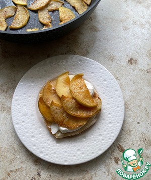 Затем выложить слой карамелизированных яблок и и запечь в разогретой духовке под грилем до расплавления сыра (пара минут).