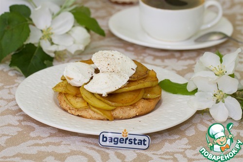 Другой вариант подачи - на подсушенную половинку булочки выложить веером дольки карамелизированных яблок, сверху выложить шарики мороженного. Подавать немедленно!