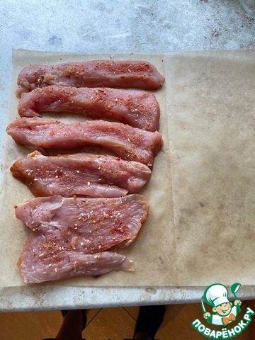 Бумагу для выпечки тонко смазать растительным маслом без запаха. Филе индейки (или куриное) нарезать пластинками, посолить, добавить специи по вкусу.