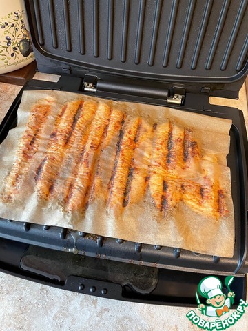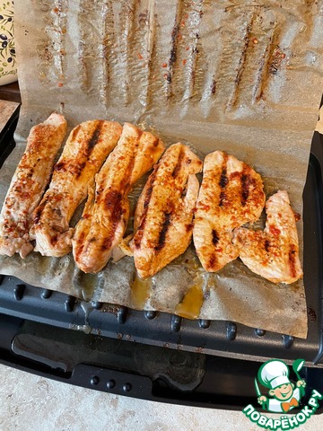 Выложить филе на бумагу для выпечки, сверху накрыть листом. Готовить на гриле, накрыв крышкой, примерно 8-10 минут до готовности. Мясо можно приготовить на сковородке традиционным способом.