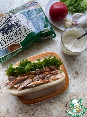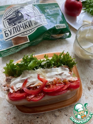 Для приготовления хот-догов использую булочки от ТМ Bagerstat. Булочки раскрыть, щедро смазать соусом, выложить слой нарезанного филе, с одного края проложить листья салата.