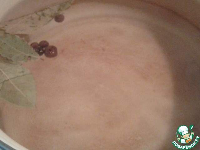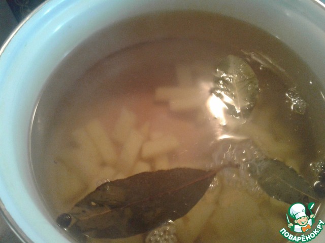 2 л воды довожу до кипения, солю, закидываю лаврушку и душистый перец