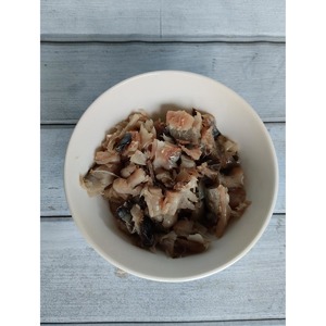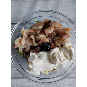 Скумбрию очистить от кожи, костей, внутренностей и пленки с рёбер (иначе будет горчить). Порезать на маленькие кусочки.