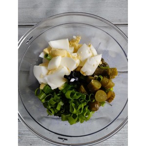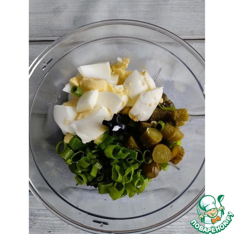 Корнишоны и лук измельчить, яйца почистить от скорлупы и нарезать. Все ингредиенты поместить в чашу блендера и опять измельчить.