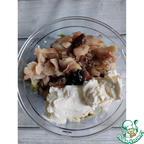 Далее в чашу блендера добавляем рыбу, сыр и тщательно измельчаем до получения однородной паштетной массы.