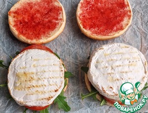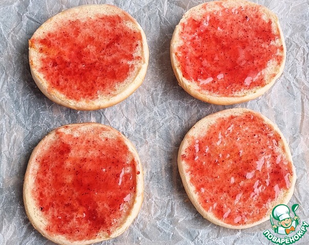 Смазать половинки брусничным соусом (можно клюквенным или вишневым).