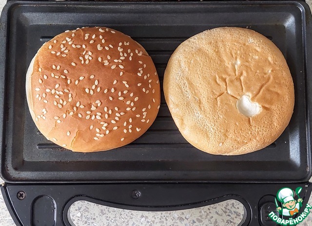 Булочки раскрыть на половинки и обжарить срезом вниз. Для обжарки я буду использовать мультипекарь с панелью гриль. Крышку во время обжарки не закрывать.
