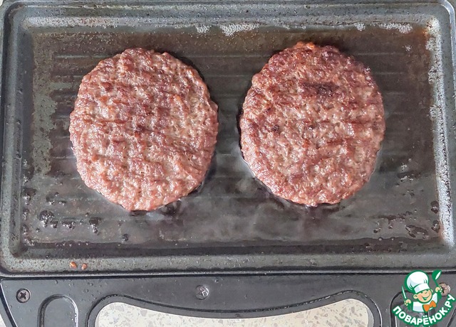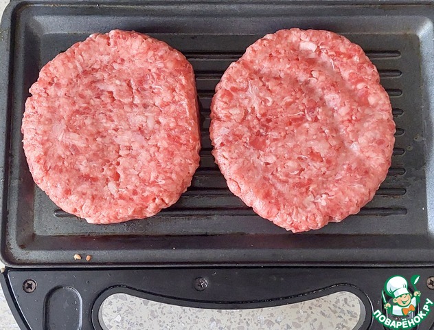 Головку камамбера разрезать вдоль пополам. Накрыть половинками сыра котлеты, срезом вниз. Закрыть крышку мультипекаря буквально на 10 -15 секунд, чтобы сыр начал плавиться.